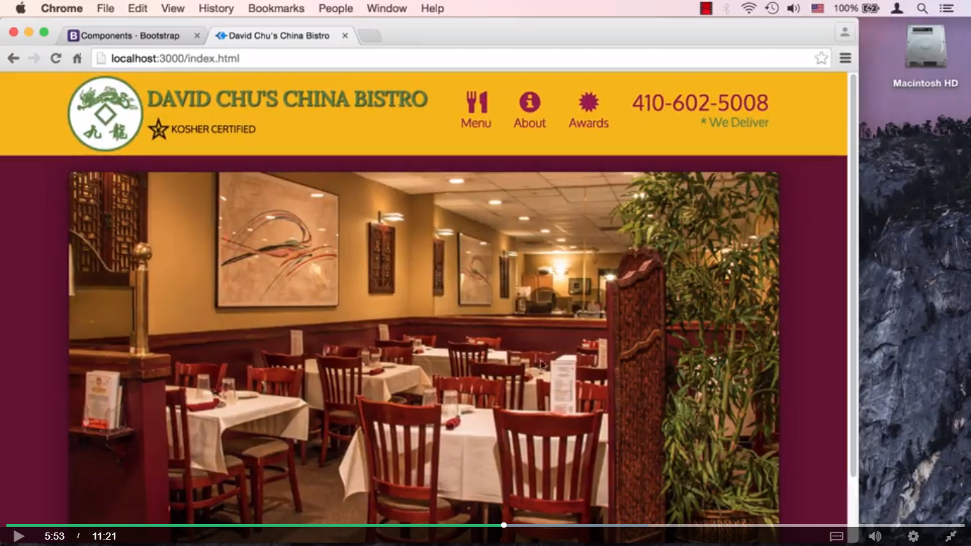 So now we're ready to embark on actually doing the main content of the page. And what we're going to start with is this giant picture of the restaurant, of the interior of the restaurant, which is actually what's called the Jumbotron in bootstrap speak. However before we start, we're going to have to define some element that is going to be a container for everything that is inside of our website. And that's simply because remember, we put in the container our header and we want everything nicely aligned to its edges. So we need a top level element within our main content to have a container class assigned to it. Let's go ahead and start with that. Let's go back to code editor, let's open up the index.html that is located at this point in the examples lecture 34 after folder. And we'll go ahead and scroll down right below our cold button right here and we'll open up another DIV. We'll say div.container and we'll press tab and that's the emit plug-in that's helping me do this. And we'll actually give it even an ID so that way later it will be much easier for us to target it. We'll call it main-content. Main-content. Okay, so here's out main content, and now we're ready to code up our jumbotron. Well the way we're going to code our Jumbotron is we have a whole bunch of images in the Images folder. As you can see, jumbotron, they all are sized very differently. The first one is 768, that one is 768 pixels wide. Then there's jumbotron 992. That one is 992 pixels wide, and finally the 1200 one is the biggest one there. And obviously what we want from this is, to be able to substitute different pictures, different resolutions, depending on the screen size. So, assuming the smallest screen size, the smaller device, and it's probably mobile, And therefore we don't want to waste our bandwidth so let's go ahead and create a div that's going to contain our jumbotron. We'll press tab here and that's the DIV. And what's going to happen is we're going to assign a background CSS property to this DIV and it's going to load the image responsively. Meaning depending on the media query it's going to appear and is going to load different size image. However we have one limitation. We can't stretch and construct the image when it is sized that ways of background image. And we needed to stretch and contract when it's very small and I'll show you in a minute what I mean. I'm going to go ahead and paste a little bit of code here. And I pre-made this code for you before. And what it's doing is it's creating an image tag. And the image tag is taking the smallest Jumbotron picture there is and assigning some old text. And this is the most important part here. The classes, the class IMG responsive comes from Bootstrap. And basically what it says is, as I change the width of the browser, the width and the sizing of the image is going to change proportionally. And that's very important for us, something we really can't do with a background image very well. And also I'm only going to make this visible when the screen is extra small. Which means if I save this right now, And go back to my browser, I'll see that this is showing up but the the image is not showing up. But if I squeeze the browser all the way to extra small you'll see that the image actually showed up. So I want only this img tag to show up when it's extra small. But for higher widths of the browser, I'm going to use the a background image in order to the size the image. Notice that we already see the effects of our container div, you can see how the edges of our header are aligning very nicely with the edges of our main content.
